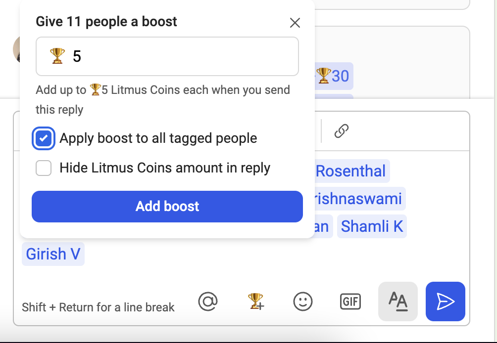After clicking ‘Add boost’ you will see points given to all mentioned people in the reply